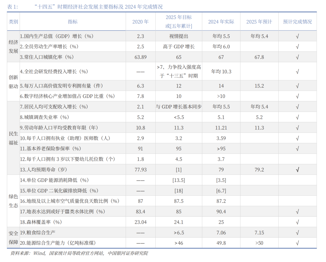 “十四五”目标回顾:“十四五”即将收官,20个经济社会发展主要指标大部分可顺利完成,其中创新驱动和安全保障相关指标已提前超额达标。民生福祉领域中的“幼有所育”——每千人口拥有3岁以下婴幼儿托位数,以及绿色生态领域中的单位GDP能耗和单位GDP二氧化碳排放降低实现目标仍需努力。“十四五”规划纲要正文提及的细项指标中,基础研究强度和战略性新兴产业增加值占比,截至2024年尚未达到预期目标。