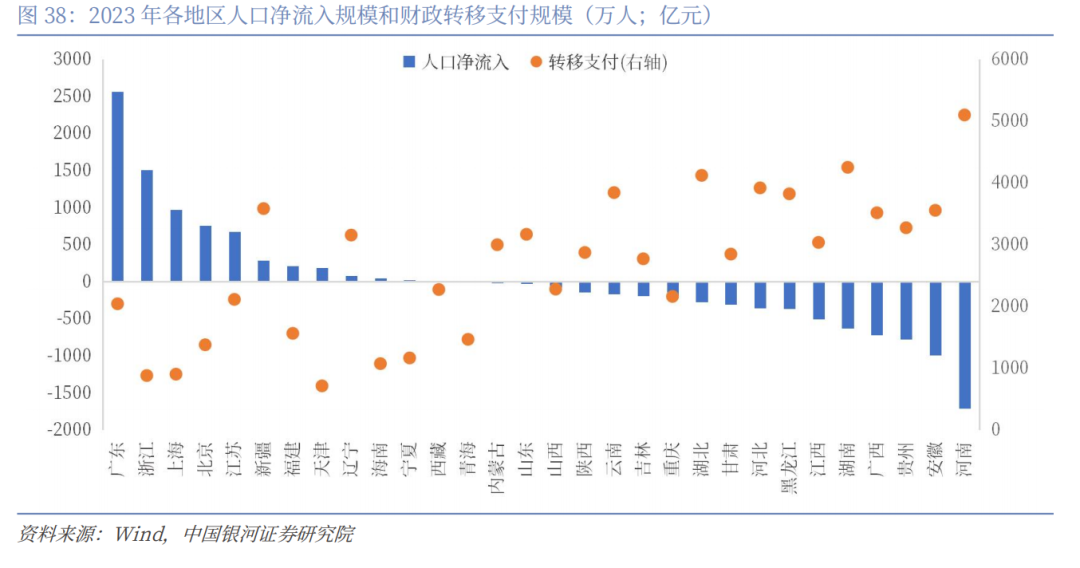 三是深入推进以人为本的新型城镇化战略,建立“财随人走”的转移支付机制。二十届三中全会强调要,健全推进新型城镇化体制机制。过去,我国财政转移支付对于人口净流出地区规模较大,一定程度上造成了基建过剩和公共服务的区域内结构性失衡,经济发达地区虽然财政收入较高,但相对持续流入的人口而言公共服务能力仍有较大缺口,而经济相对落后的人口净流出地区在转移支付的惯性下,基建相对人口而言实际过剩。结合未来“以人为本”的新型城镇化战略推进,财政资源的区域间分配也将进一步建立“财随人走”的转移支付机制,加大对教育、医疗、住房等领域的投资,推动“相关公共服务随人走”。