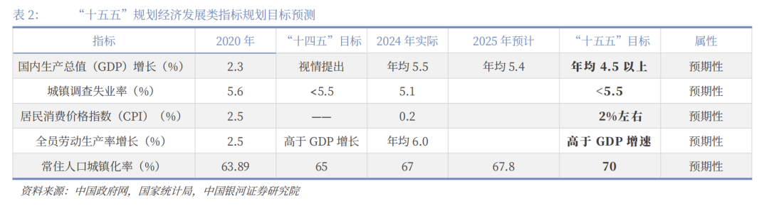 对于经济社会发展指标,我们重点选取 GDP、失业率、CPI、全员劳动生产率、常住人口城镇化率等五个经济社会发展指标进行展望,具体如下: