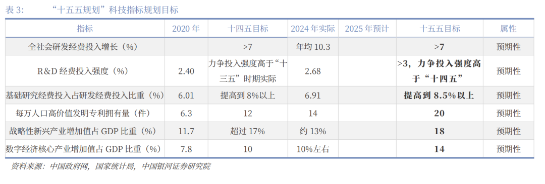 中国式现代化关键在科技现代化。要加快构建支持全面创新体制机制,进一步夯实科技创新在现代化建设中的核心地位,以科技创新引领产业创新,积极培育和发展新质生产力,为中国式现代化注入强大动力。我们认为,“十五五规划”将进一步强化新质生产力相关量化指标重要性,如基础研究强度、人均专利数、战略性新兴产业增加值占比、数字经济核心产业增加值占比等。