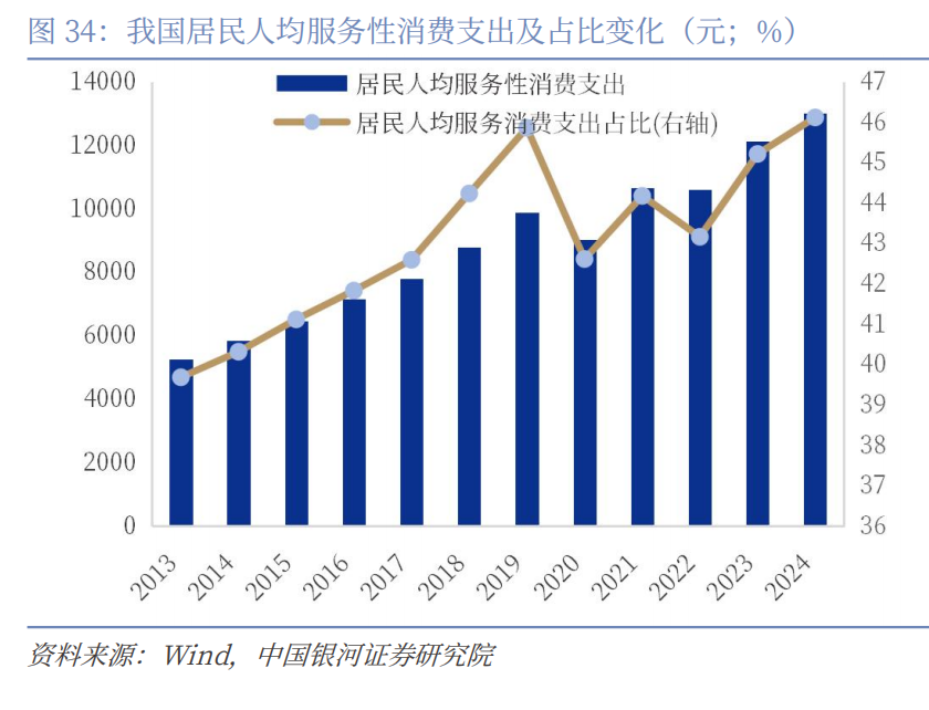 扩大消费占比的主要方向:(1)促进消费提质升级,大力发展服务消费。2024年,我国服务消费占比为46.1%,与发达经济体仍有较大差距。(2)财政支出从投资于物向投资于人转变,社保水平有望显著提升,育儿、学生、特困人群等重点领域补贴有望扩容、扩面、扩量。(3)稳步推进共同富裕,深化收入分配制度改革,提高居民收入在国民收入分配中的比重,提高劳动报酬在初次分配中的比重;(4)以消费税改革为抓手推动地方政府从生产型政府向服务型政府转向,地方发展将更加重视消费,包括文体娱等服务消费。
