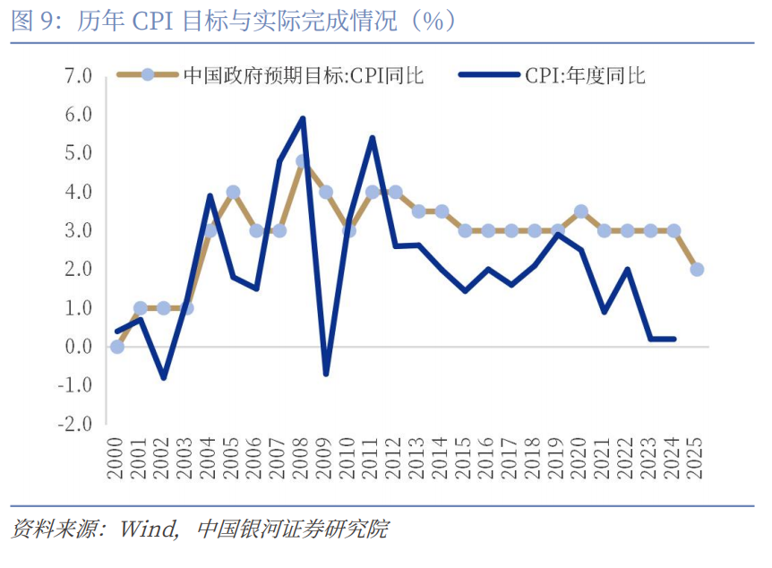 三是或增设2%左右的居民消费价格指数(CPI)指标,作为促进物价低位回升、保持物价总水平基本稳定的重要指标。物价持续偏弱运行是经济供求关系失衡的典型体现。“十四五”以来,我国处于低通胀环境,2022年CPI为2.0%,其余均在1%以下(2021年为0.9%,2023-2024年均为0.2%)。截至5月PPI同比已连续32个月录得负值。2025年《政府工作报告》将2025年CPI预期目标下调为2.0%左右。我们认为这一变化并不能简单理解为降低了对于通胀的要求,而是对物价压力有了更加深刻的认识,体现出更为实事求是的态度。以往对于通胀目标的管理主要是防止经济过热,3%左右的CPI目标在执行层面是物价的上限阈值,即政策应该防止CPI超过3%。但近年来,尤其是2022年以来我国CPI同比整体下降到 2%以下,甚至在较长时间内出现月度同比负增长。因此,通胀目标的核心问题应该不仅是防止经济过热,同时也要防止物价过低。在“促进物价合理回升”的要求之下,2%左右的 CPI 目标或成为一个通胀水平的平均目标,即合理的物价水平不应偏离2%过多。“十五五”时期,促进物价低位回升成为更重要目标。可设定2%左右的CPI指标,加快推动我国物价企稳回升。