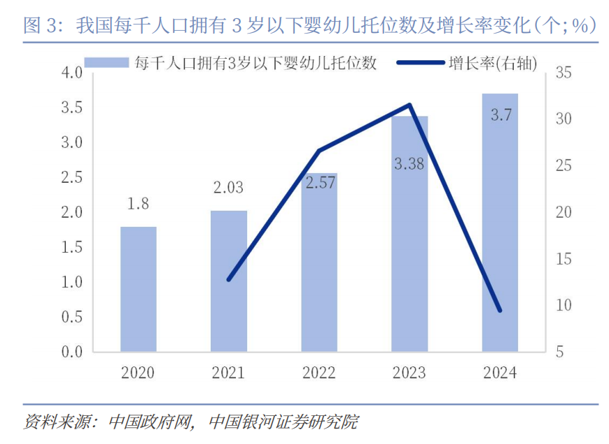 第二,民生福祉中每千人口拥有 3 岁以下婴幼儿托位数完成规划目标还需要努力。截至 2024年 , 每 千 人 口 拥 有 3 岁 以 下 婴 幼 儿 托 位 数 为 3.7 个 , 完 成 “ 十 四 五 ” 目 标 4.5 个 还 有 一 定 距 离(2021-2024 年年均增长 0.475 个),预计完成目标还需要努力。