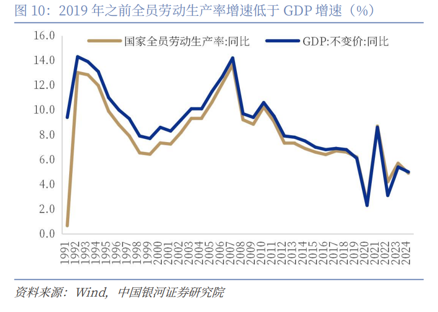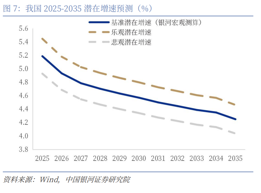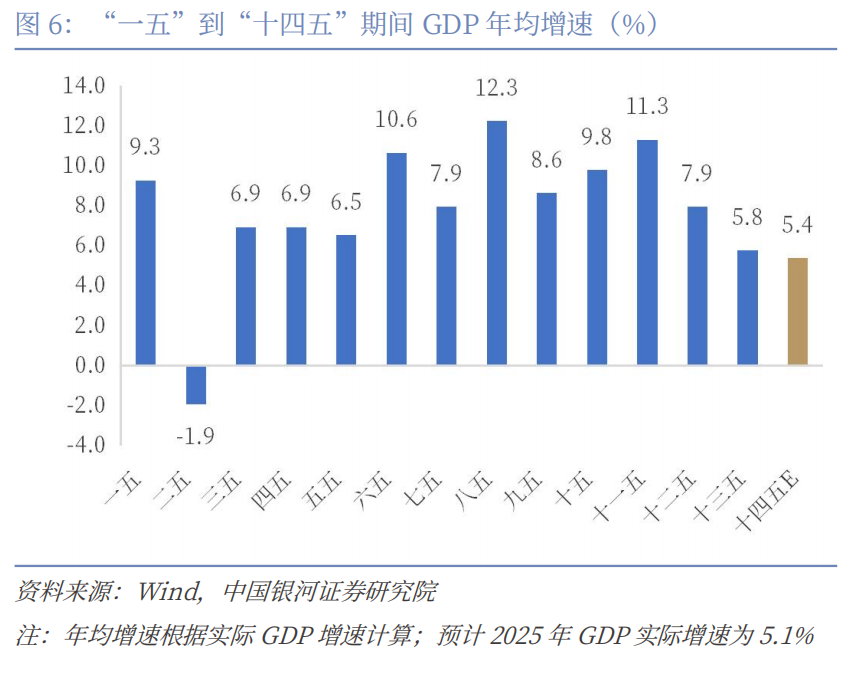 另一方面,“十五五”时期发展任务艰巨。4 月 30 日,习近平总书记强调:“谋划“十五五”时期经济社会发展,必须准确把握“十五五”时期的阶段性要求,着眼强国建设、民族复兴伟业,紧紧围绕基本实现社会主义现代化目标。”“十二五”以来,多重因素影响下,我国经济发展进入新常态,经济增长向中速收敛,GDP 年均增速从“十一五”的 11.3%降至“十四五”的 5.4%。习近平总书记在关于《中共中央关于制定国民经济和社会发展第十四个五年规划和二〇三五年远景目标的建议》的说明中,明确提出到 2035 年实现经济总量或人均收入翻一番目标。根据测算,要实现 2035 年 GDP 总量翻一番的目标,则 2021-2035 年 GDP 年均增速要达到 4.7%。今年是“十四五”规划最后一年,我们预计 2025 年实际 GDP 增长 5.1%,则 2026-2035 年(“十五五”“十六五”时期)人均 GDP 增速要达到 4.4%。 “十五五”时期是迈向 2035 年基本实现社会主义现代化承上启下的关键五年,在内外部宏观环境发生较大背景下,我国面临的发展任务较大。需要以改革促发展,提高全要素生产力,解决长期内生增长动力不足问题,提升潜在经济增速,助力 2035 年远景目标顺利实现。