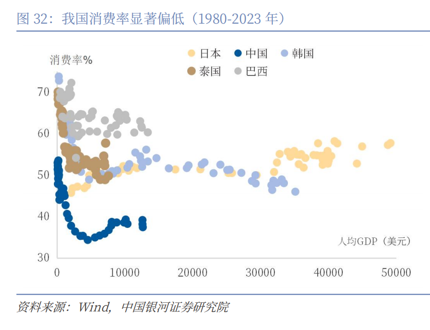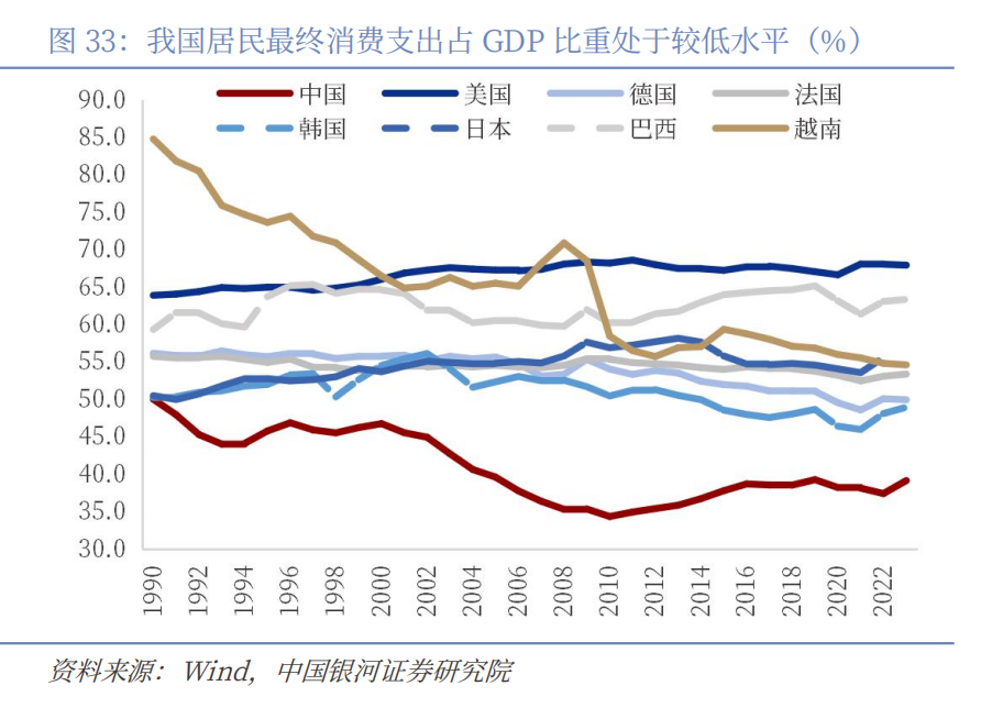 我国消费率显著偏低,消费不足长期存在。横向国际比较来看,我国消费率不仅低于发达国家,还大大低于同为东亚文化下的日本和韩国,甚至在某些阶段大大低于比我国人均GDP水平低很多的菲律宾、泰国、印度等国家。即使考虑到统计上我国过去用成本法统计住房消费、服务消费存在遗漏等低估消费率的因素,纵向来看我国消费率在过去二十年的经济发展中并没有明显变动,说明我国消费潜力没有得到长足的释放。2010年以来,我国居民最终消费占GDP比重有所上行,从2010年的34.33%上升到2023年的39.13%,但一直低于40%。这一比例不仅低于美国(2023年为67.9%)、日本(55.58%)等发达国家,也低于巴西(2023年为63.33%)、越南(2023年为54.58%)等发展中国家。