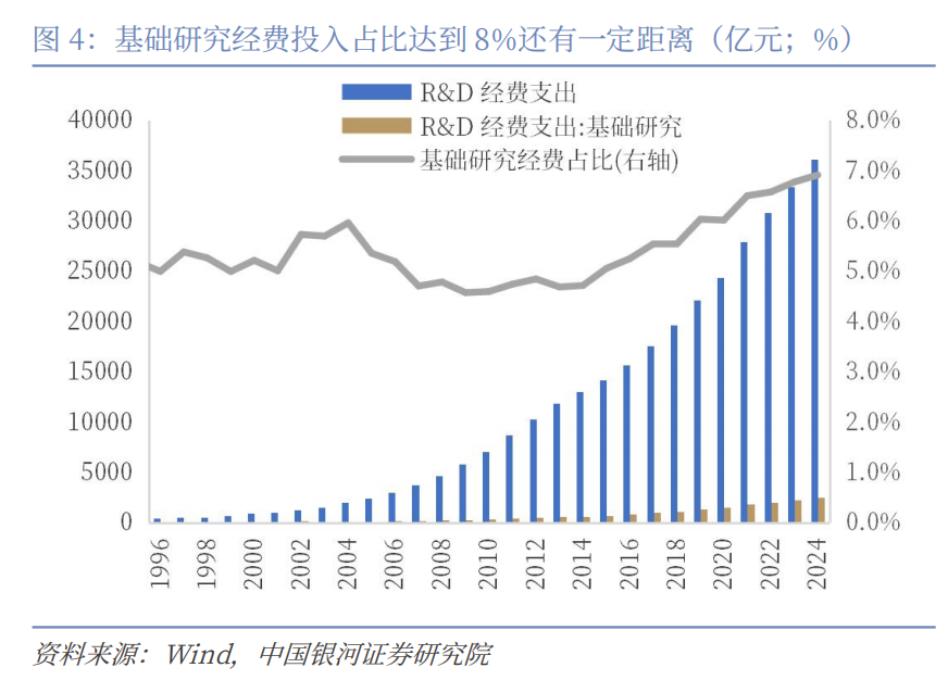 三是基础研究经费投入占研发经费投入比重可设定提高到8.5%以上。“十四五”目标为提高到8%以上,但2024年基础研究经费投入占研发经费投入比重为6.91%,与目标还有较大距离。同时,尽管2024年我国基础研究经费总量达到2497亿元,规模位列世界第二位,但基础研究经费投入占研发经费投入比重,相比发达国家普遍15%以上的水平仍然差距很大。三中全会强调,要提高科技支出用于基础研究比重。“十五五”基础研究经费投入占研发经费投入比重可设定提高到8.5%以上。