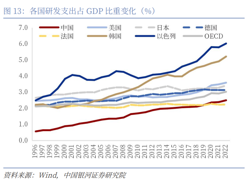 二是R&D经费投入强度设定为3.0%以上,力争投入强度高于“十四五”。2024年我国R&D经费投入强度为2.68%,较2020年提高了0.32个百分点,低于OECD国家平均3.02%,与以色列(6.02%)、美国(3.59%)、日本(3.41%)、德国(3.13%)等科技强国仍有较大差距(OECD、以色列、美、日、德数据均为2022年)。“十五五”时期R&D经费投入强度可设定为3.0%以上的目标,推动在研发强度上加快追赶美德等发达国家。