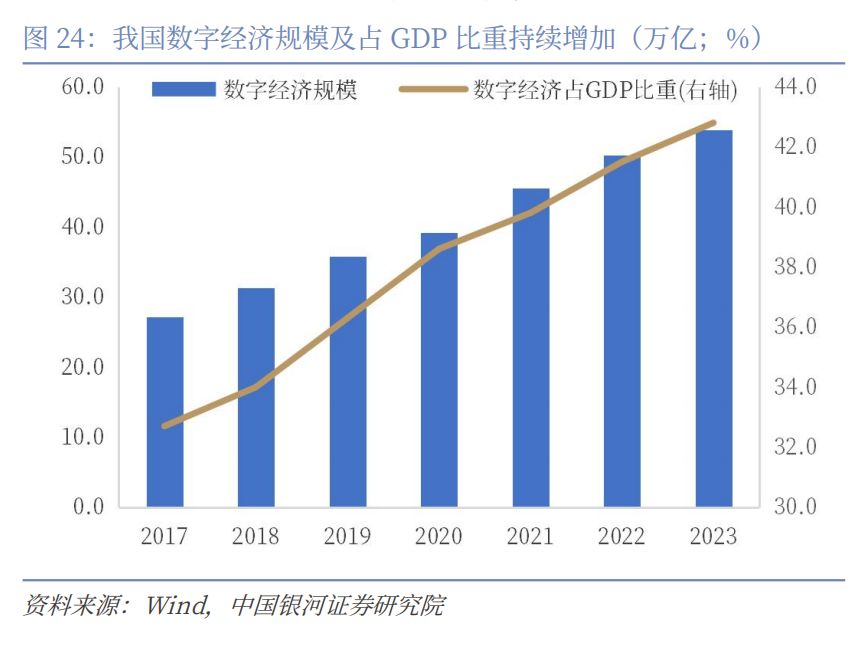 六是数字经济核心产业增加值占GDP比重设定提高到14%。数字经济核心产业增加值,指我国数字经济核心产业所有常住单位一定时期内生产活动所创造的新增价值。国家统计局数据显示,2023年我国数字经济核心产业增加值为127555亿元。2024年,我国数字经济核心产业增加值占GDP比重达到10%左右。“十五五”时期,数字经济核心产业增加值占GDP比重可设定提高到14%以上,进一步培育壮大数字经济核心产业,发挥数字经济核心产业稳增长促转型的重要引擎作用。