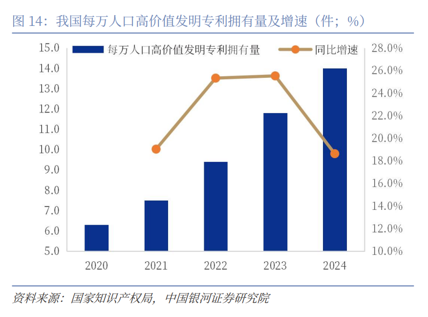 四是每万人口高价值发明专利拥有量设定为20。该指标是“十四五”最新提出,与“十二五”“十三五”的“每万人口发明专利拥有量”更强调高质量创新。2024年底,我国每万人口高价值发明专利拥有量达到14件,较2020年的6.3件增长了1.2倍,提前实现国家“十四五”规划预期目标。“十五五”每万人口高价值发明专利拥有量目标值可设定为20,年均增速10%以下,较为理性且实际。