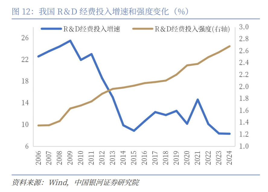 一是全社会研发经费投入增长设定高于7%。“十二五”和“十三五”我国全社会研发经费投入年均增速分别为19.0%、11.7%,“十四五”时期,2021-2024年,全社会研发经费投入年均增长10.3%。“十五五”时期全社会研发投入增速可设定相对较高目标(可设定高于7%),确保全社会研发经费稳步增长。