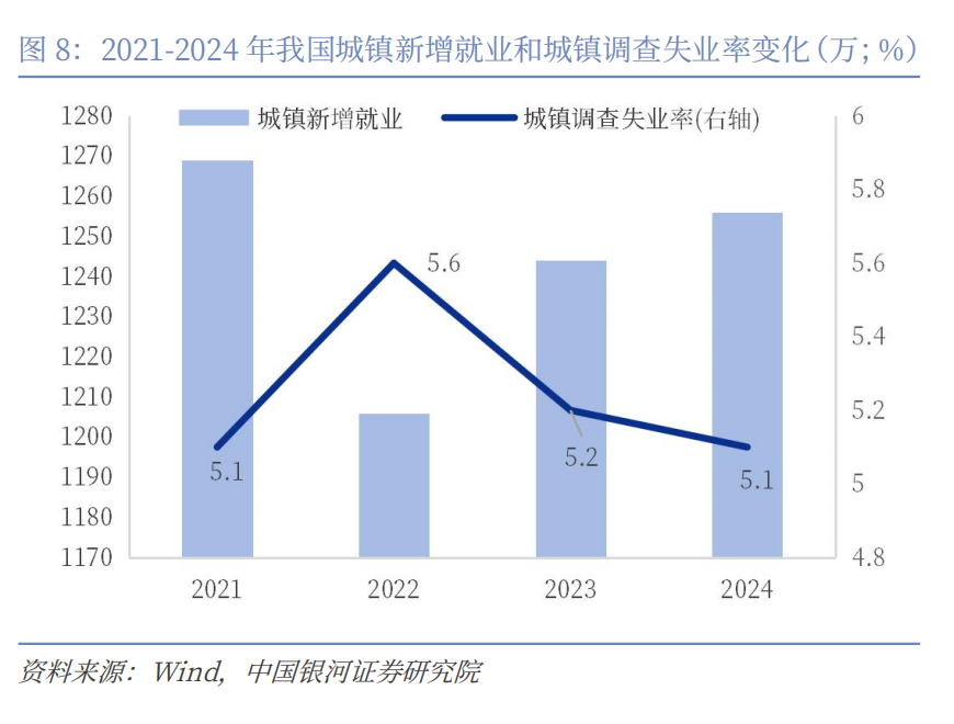 二是城镇调查失业率仍保持为5.5%以内,作为底线思维的重要参考。就业是最大的民生。习近平总书记多次强调,要坚持就业优先战略,把解决人民群众就业问题放在更加突出的位置,努力实现更高质量和更充分的就业。充分就业不仅是经济发展的关键要素,也是社会稳定的重要保障。2021年,“十四五”规划首次将“调查失业率”纳入目标体系,并将目标设定为5.5%,“城镇新增就业人数”自九五规划以来首次缺席。调查失业率的目标更加明确,“十四五”来看就业目标的重要性已经大过于经济增长。2023年7月政治局会议首次提出“要把稳就业提高到战略高度通盘考虑”,我们认为这标志着政策之锚从过去的GDP转为就业。“十五五”时期,我国宏观经济环境面临更大不确定性,要把稳就业尤其是稳定青年群体就业摆在更重要的战略高度。