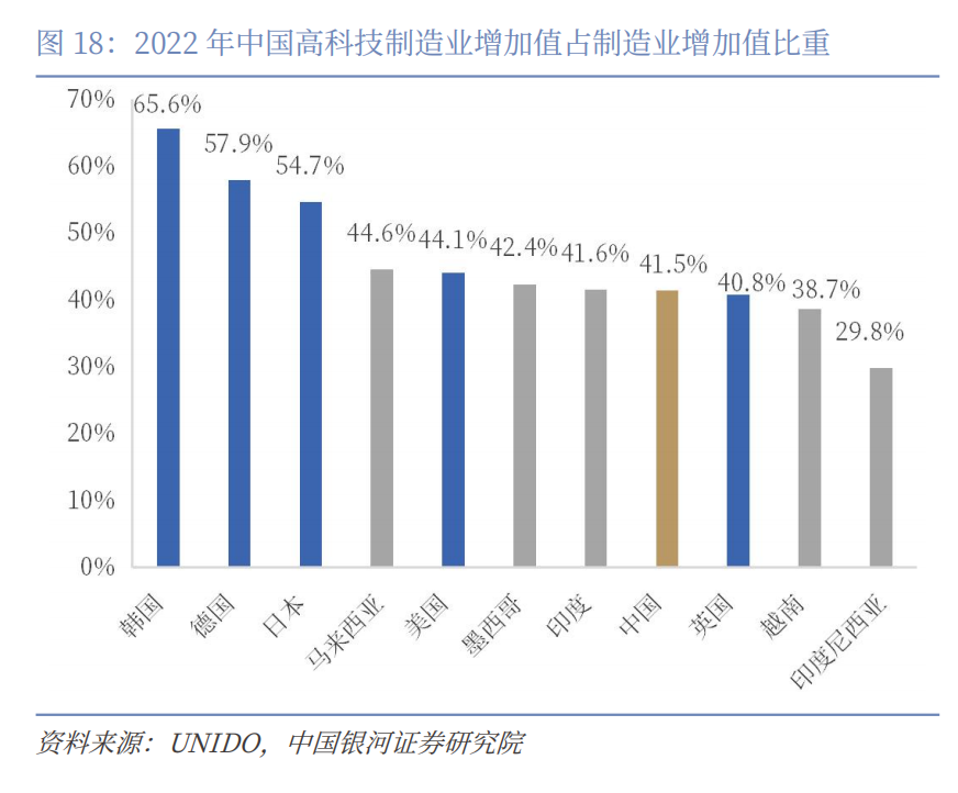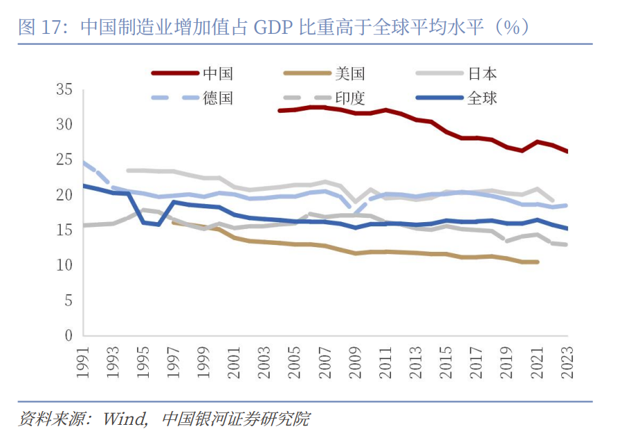 必须保持制造业合理比重,为中国式现代化提供基础性、全方位支撑。制造业是国民经济的重要支柱,是一个国家实现现代化和成为经济强国的基础。二十届三中全会《决定》,强调要“建立保持制造业合理比重投入机制,合理降低制造业综合成本和税费负担。”2025年5月19日,习近平总书记在河南洛阳调研时强调,推进中国式现代化必须保持制造业合理比重。一方面,我国制造业增加值占GDP比重处于下行趋势。世界银行数据显示,我国制造业增加值自2010年首次超过美国,2022年占全世界比重达到30.2%,稳居世界首位。从国际经验来看,随着各国进入后工业化社会,制造业占比下降是普遍规律。全球制造业增加值占GDP比重从1980年的24.58%下降至2023年的15.24%。德国、日本制造业增加值在GDP中的占比长期在18%以上,制造业一直是其参与国际竞争的“杀手锏”。中国该占比在主要大国中处于最高水平,但近年也处于下行趋势,2006年为32.45%,2023年下行至26.18%。另一方面,我国制造业在全球产业分工中总体上仍处于价值链中低端。2022年,我国高科技制造业增加值占制造业增加值比重为41.5%,低于德国、日本等科技强国,也低于马来西亚、墨西哥、印度等发展中国家。“十五五”时期将坚持走高质量发展之路,着眼强国建设、民族复兴伟业,紧紧围绕中国式现代化,统筹发展与安全,保持制造业合理比重,把因地制宜发展新质生产力摆在更加突出的战略位置,加快建设现代化产业体系。
