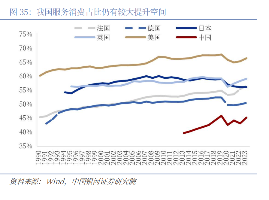 随着我国经济发展和人均收入的提高,我国服务消费整体上不断增长,服务消费占总消费比重也处于上升趋势。但从国际比较看,我国服务消费占比仍有较大提升空间。其一,我国服务消费水平滞后于当前经济发展阶段。按照购买力评价,我国2023年人均GDP大致对应1991年的美国、1996年的日本、1999年的英国,但我国2023年服务消费占比为45.2%,与美国(61.5%)、日本(55.2%)、英国(56.5%)差距较大。其二,我国服务消费占比与发达经济体仍有较大差距。2023年,我国服务消费占比,与美国(66.4%)、英国(59.1%)、法国(56.6%)、日本(56.1%)、德国(50.5%)等发达国家相比仍有较大差距。“十五五”时期,要把服务消费作为消费扩容升级的重要抓手,优化和扩大服务供给,释放服务消费潜力,为经济高质量发展提供有力支撑。