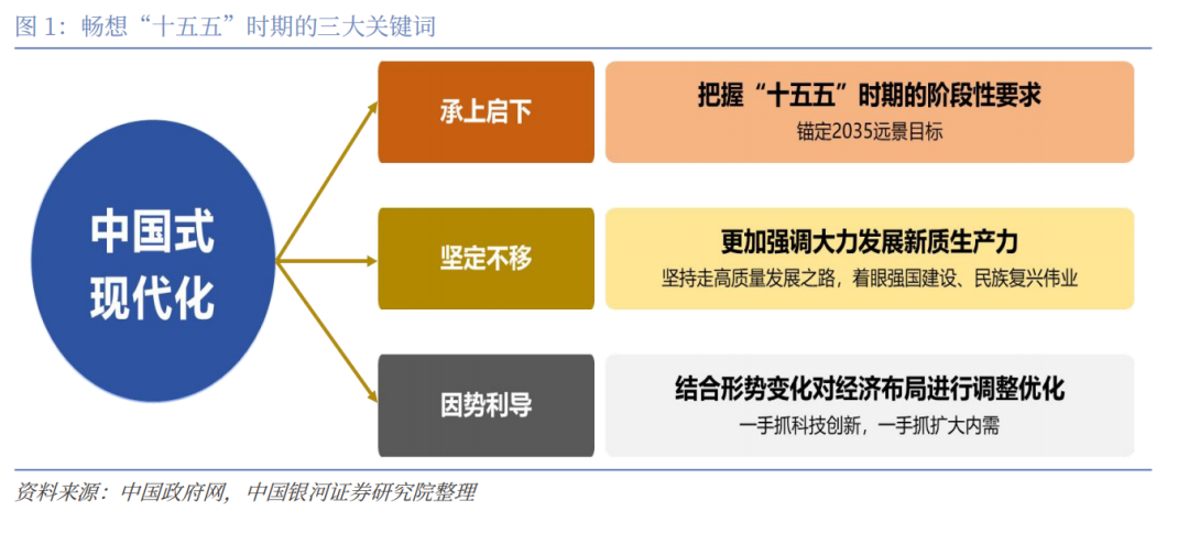 展望“十五五”,我们认为,“十五五”时期我国将面对更为纷繁复杂的国际国内形势,经济社会发展将面临更大挑战,要坚定不移办好自己的事,坚定不移扩大高水平对外开放,以高质量发展的确定性应对外部环境急剧变化的不确定性。通过梳理近期高层的调研、会议及讲话精神,并结合“十五五”的时代背景,我们认为“十五五”时期要重点把握三大关键词——承上启下、坚定不移和因势利导。