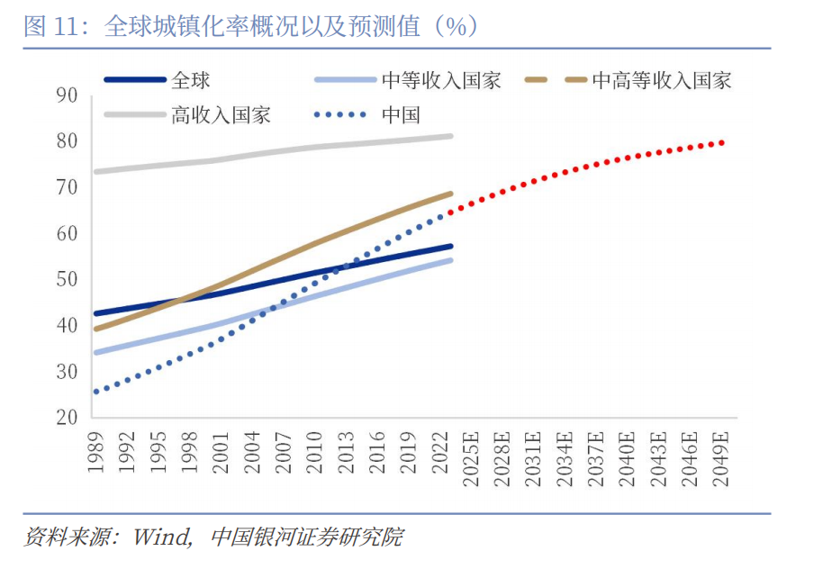 五是常住人口城镇化率目标值可设定为70%。改革开放以来,我国常住人口城镇化率从1982年的21.1%增长到2024年的67.0%,城镇化率大幅提升。参考其他国家的经验,我国城镇化率仍存在较大提升空间。IMF数据显示,2023年我国的城镇化率已超过中等收入国家平均水平,正逼近中高等收入国家的平均水平,根据其预测,2030年我国城镇化率有望超过70%。“十三五”和“十四五”时期,我国常住人口城镇化率年均增幅分别为1.31和0.78个百分点。“十五五”时期,我国常住人口城镇化率目标值可设定为70%。