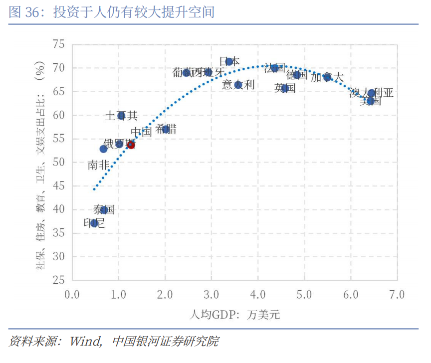 一是继续加大财政对教育、医疗、住房等民生领域的投入,切实体现“投资于人”的发展理念。国际经验来看,民生社保占财政支出比重随人均GDP同比增长。2025年《政府工作报告》提出,推动更多资金资源“投资于人”。要进一步优化财政支出结构,加大对教育、医疗、住房等领域支持力度,不断增进民生福祉。