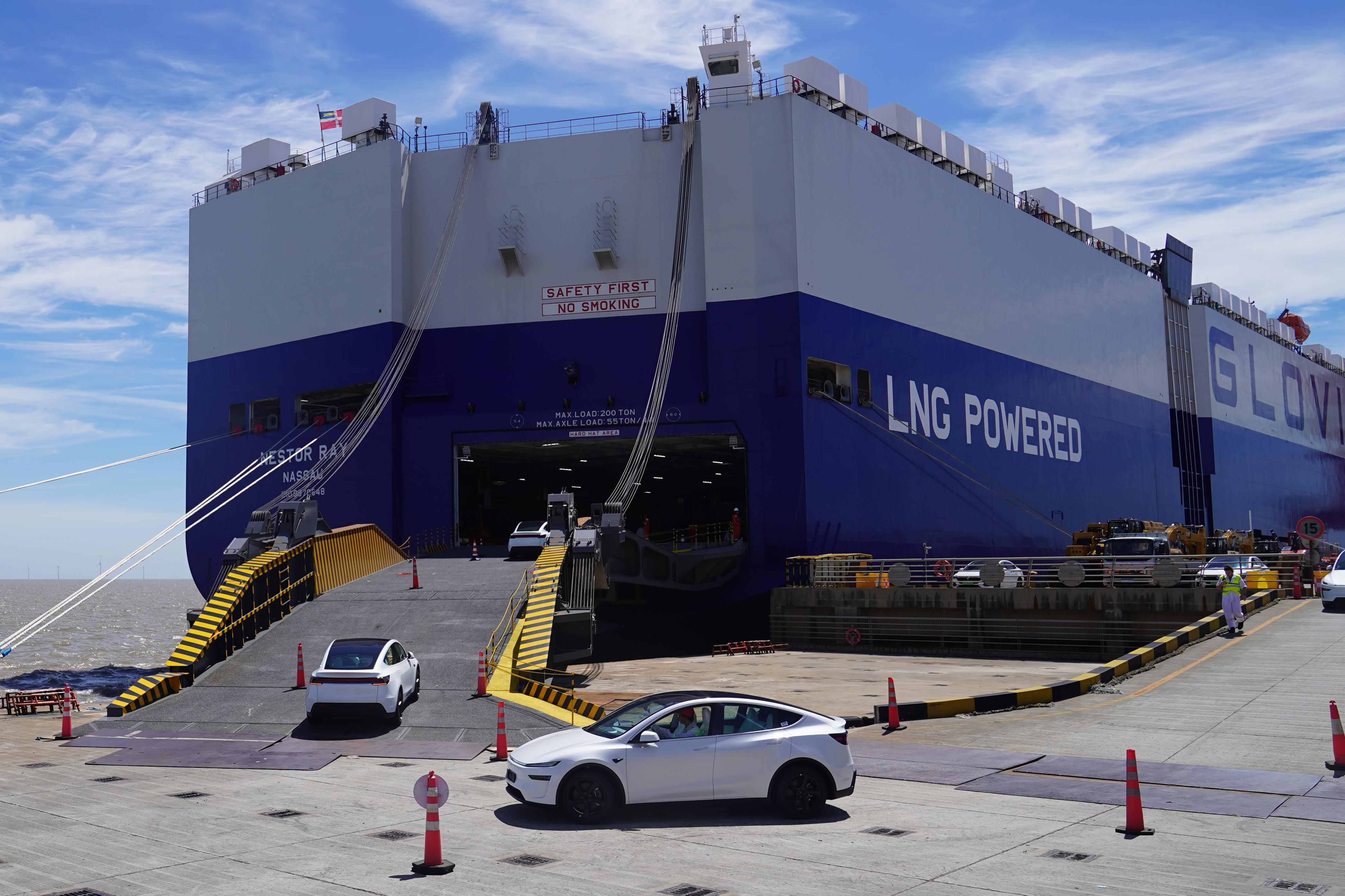 2025年7月2日,在上海自贸试验区临港新片区南港码头,一批新能源汽车驶向一艘滚装货轮。新华社记者 杨有宗 摄