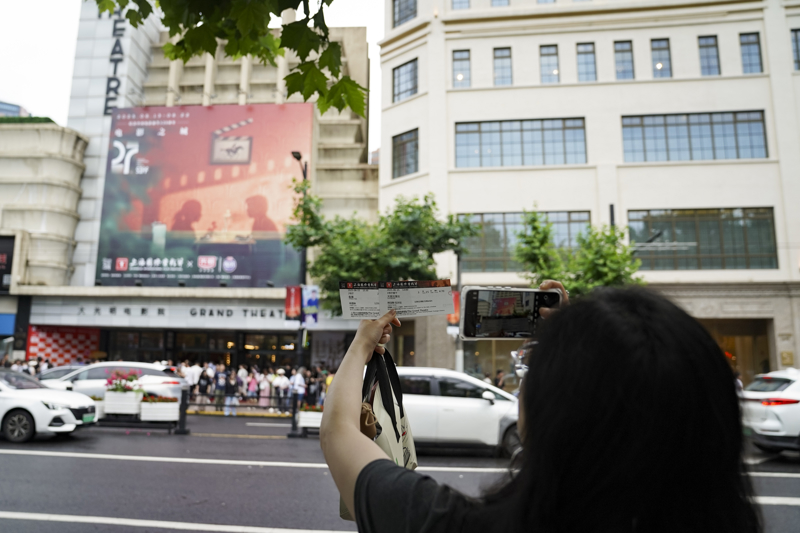 新华社照片,上海,2025年6月20日\n 6月15日,来自杭州的影迷在上海大光明电影院打卡拍照。\n 第27届上海国际电影节期间,上海市各区40余家展映影院、200余家公映影院,联动全市核心及重点商圈,打造“看电影+吃喝玩乐”周边消费生态圈。观众持电影节票根可享餐饮、购物等多场景优惠,电影票根成为城市消费“通行证”。\n 新华社发(陈浩明 摄)