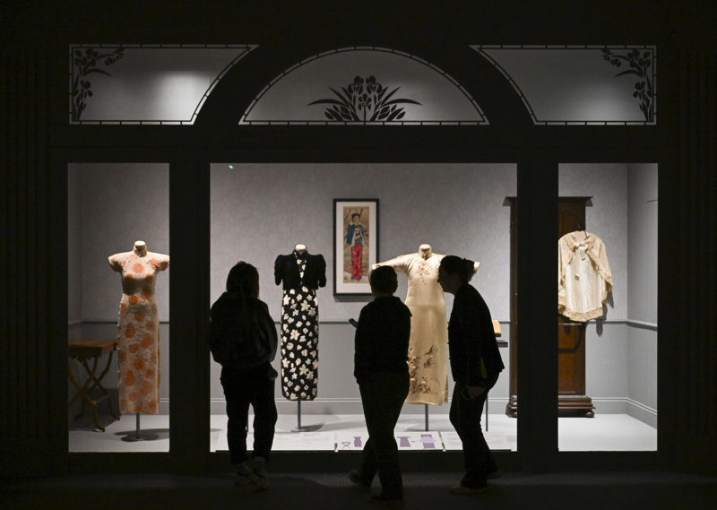 新华社照片,上海,2025年12月22日\n 12月22日,观众在“摩登华影:海派旗袍与百年时尚”预展上欣赏展品。\n 12月22日,“摩登华影:海派旗袍与百年时尚”特展在上海博物馆人民广场馆启幕,当晚同步举行博物馆奇妙夜活动。本次展览汇集跨度超一个世纪的旗袍及各类时尚珍品,共计306件/组展品,将于2025年12月23日至2026年5月5日向公众免费开放。\n 新华社记者 陈浩明 摄